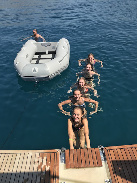 Leaving a grey London day behind us, we flew over the most perfect blue sea broken only with islands and white horses, guessing which of the small dots of yachts might be our friends’ as they headed for a mooring near us. I spied a volcano crater. They had an amazing lunch there, with amazing views, I subsequently learnt. We landed, we got our luggage immediately, we found our transfer, we arrived at Kos Marina. We had a simple Greek lunch in the sunshine with myriad masts clinking in the breeze. The waiters and waitresses wore small visors which came from the chin up, covering just their mouths so you could see their eyes and their smiles. So much less intimidating that what we had back home - and just as effective. Food eaten, drink drunk, we went to find the boat that would be our home for six days. Brand spanking new at a good price. What’s not to love? Supply and demand.